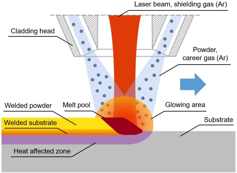 - Alloy powder is fed into the cladding zone